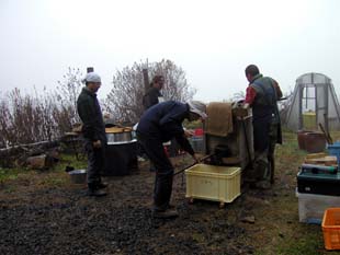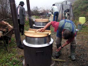 湯を沸かす大きな鍋の火に当たりながら、楽しい作業でした。