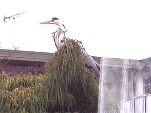 来ました!再び!今度は写真に撮れました。インターネットで調べるとどうもこの鳥は「アオサギ」のようです。 池の脇の木のてっぺんにふわりと舞い降り池の中をうかがっている様子です。 気づかれないように廊下からデジカメでパチリ。ところが曇り空だったので フラッシュが自動に焚かれ、アオサギは、飛び去ってしまいました。大きな羽を広げて‥残念! 先日見たの鳥もアオサギだったのかな? 2回も続けて、野生のこんなに大きな鳥が庭先に来るなんて‥驚き!