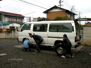 タイヤをいつ交換するか?お天気と仕事の段取りと玄文の都合(?)と相談しながら、 毎年タイミングを考えます。我が家のタイヤ交換は、子ども達の仕事です。え!大丈夫? 保育園の頃から父のタイヤ交換を毎年手伝っているうちに、だんだん手伝いの範囲が広がり 玄文が中学生になった頃からは、全部自分でやるようになりました。父は、最後のチェックを受け持つだけです 東京方面に配達に出かける朝、「タイヤ交換してくれるか?」の父の声に、朝寝坊で、まだ眠そうな顔の玄文が 「いいよ。」と答えます。他の仕事なら、文句の一つも出そうな寒い朝なのに、上着を引っ掛け冷たい小雨の降る中 へ出て行く姿に、「信じられない!」とスタッフの藤野の声。 「玄ちゃん。本当に好きでこの仕事してるの?」(藤野) 「この仕事だけは、他の人にやらせたくないくらい好きなんだ。」(玄文)!? 玄文は大好きだから良いけど、 大変なのは手伝わされる弟と妹。仕方なく(?)続いて外に出ます。 3人で協力して、30分あまりで今年もタイヤ交換が終了しました。 以前、下校途中にパンクした軽トラックのタイヤ交換をしてあげて喜ばれたこともあるとか・・ おかげで(?)母はタイヤ交換をしたことがなく、いざという時全く役に立ちません。・・