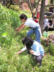 11時半。作業の手を止めて野蒜取りに工房の裏へ。雑草の中から掻き分けて野蒜を探す子供たちです。