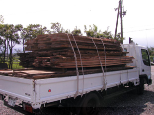 一年後、乾燥が終わった材を2tトラックをレンタルして工房に運びます。よーやく使えるぞ・・・