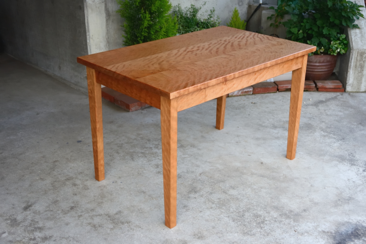 波状杢の美しい貴重な原木(B丸太)をふんだんに使いました。引出しの底板まで同じ原木(共木)です。 現品を気に入ってお買い上げいただきました