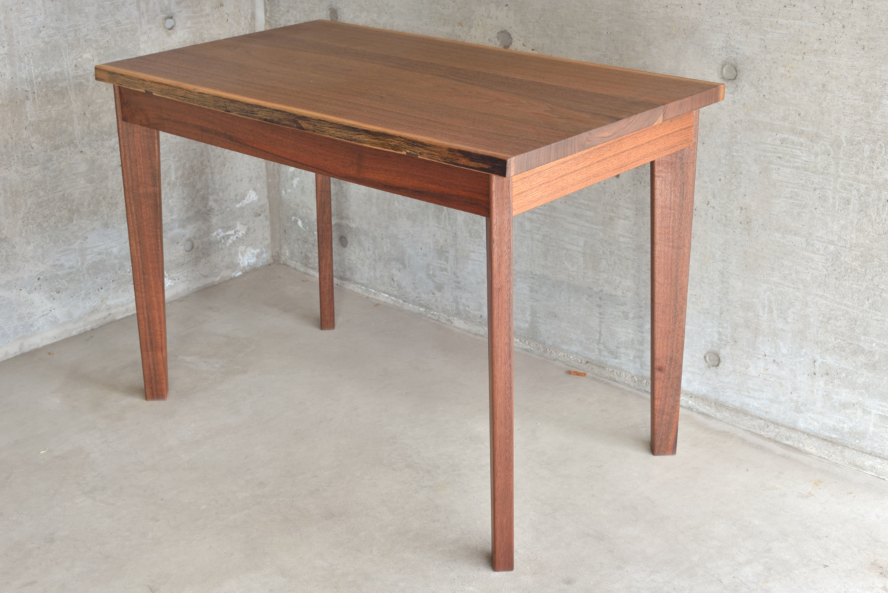 <製作メモ>構造は引き出し無しのNDタイプです。脚を斜め位置に配して、幕板を45度でドミノダボと内側からの補強で強固に結合していますので 見た目スッキリですが、頑丈です。今回は天板を2種作ったので、お好きな方を選んで頂けます。脚は一組だけです。※脚だけ違う構造(例えば引き出し付きのSDタイプなど)で作ることもできます。但しその場合は別途お見積りとなります