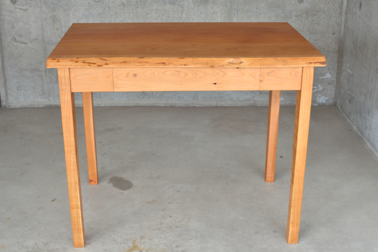 3年前に制作にとりかかり、ほとんど形になっていたが、天板の仕上げと引き出しの底板などこの度ようやく完成した。(2021年2月時)天板は耳付き3枚剥ぎ。手前の一枚は奥の2枚より少し色合いが薄い感じだが、耳がいい風合いなので手前に使った。ただ一部製材時の引っかき傷があり、仕上げに躊躇していたが、この度その部分を大胆に磨いたら、いい感じになったので、仕上げで完成となりました。