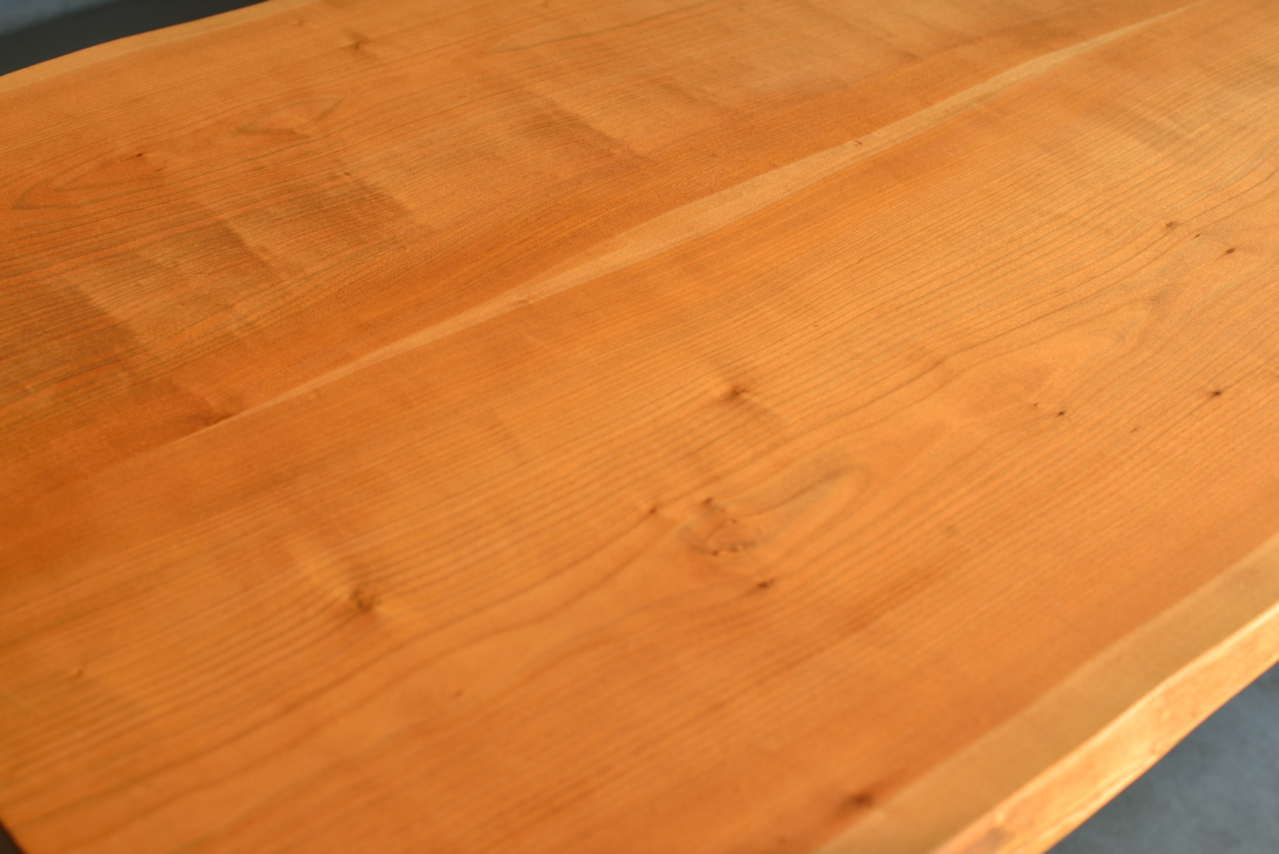 <製作メモ>天板は北海道産山桜の2枚接ぎ。敢て真ん中に少し白太を残してアクセントにした。山桜は丸太ごとに個性豊かで、これまでたくさんの個性を楽しませていただいた。この作品もなかなかの味わいがあるかとおもいます。製作から少し時間が経ち、小さなキズが少しありますが、落ち着いてきて、テーブルとしては小さい作品ながらも風格がでてきたかな。小さな机としてももちろん使えます。高さは700ですが、低くする分にには脚をカットします。