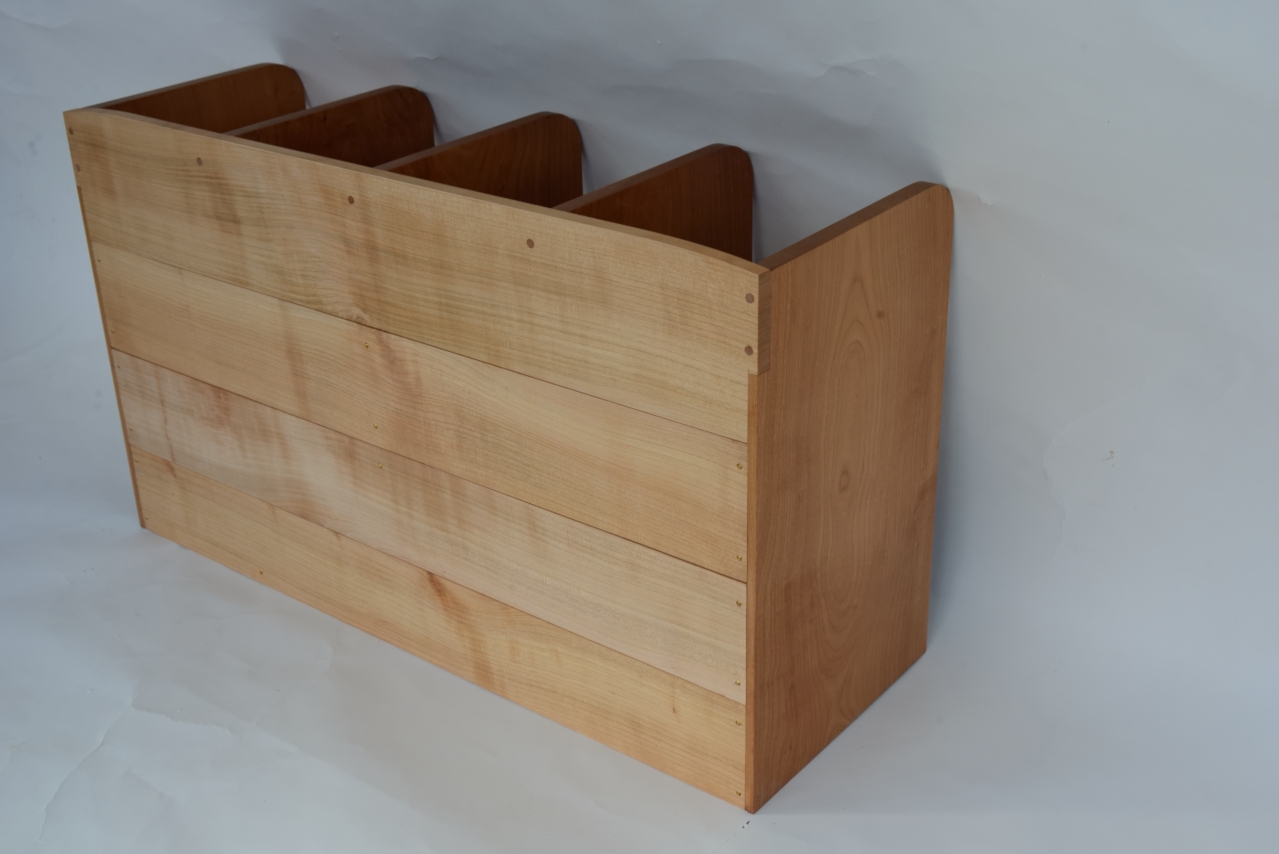 3年前にサクラの机を納品した折に、机上に置く本棚のご注文をいただきました。形は、昔から使っておられた本棚と同じデザインでというご希望で、特に側板と背板の丸みが特徴。とっておきのサクラの材を準備して、じっくり取り組みました。引出しは出しても使えるように、底板も全部サクラ。机と同じく総サクラ仕様。